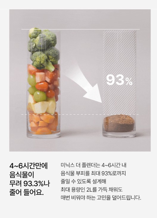 4~6시간 만에 음식물 부피를 93.3%까지 줄여주는 강력한 성능이 핵심이에요.